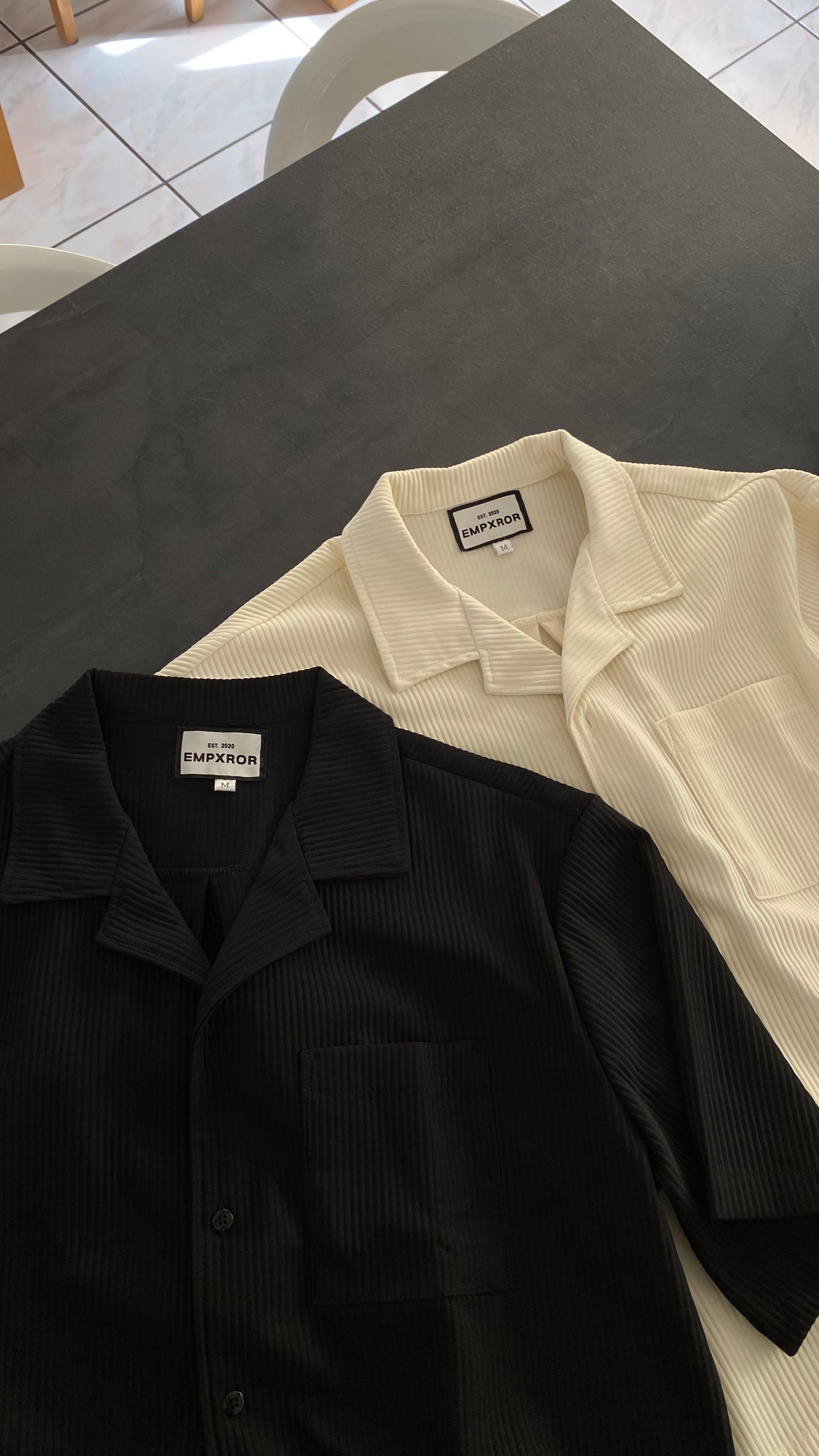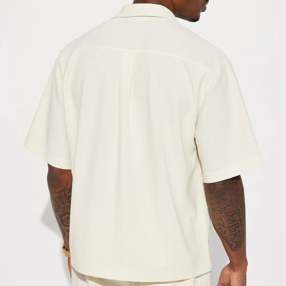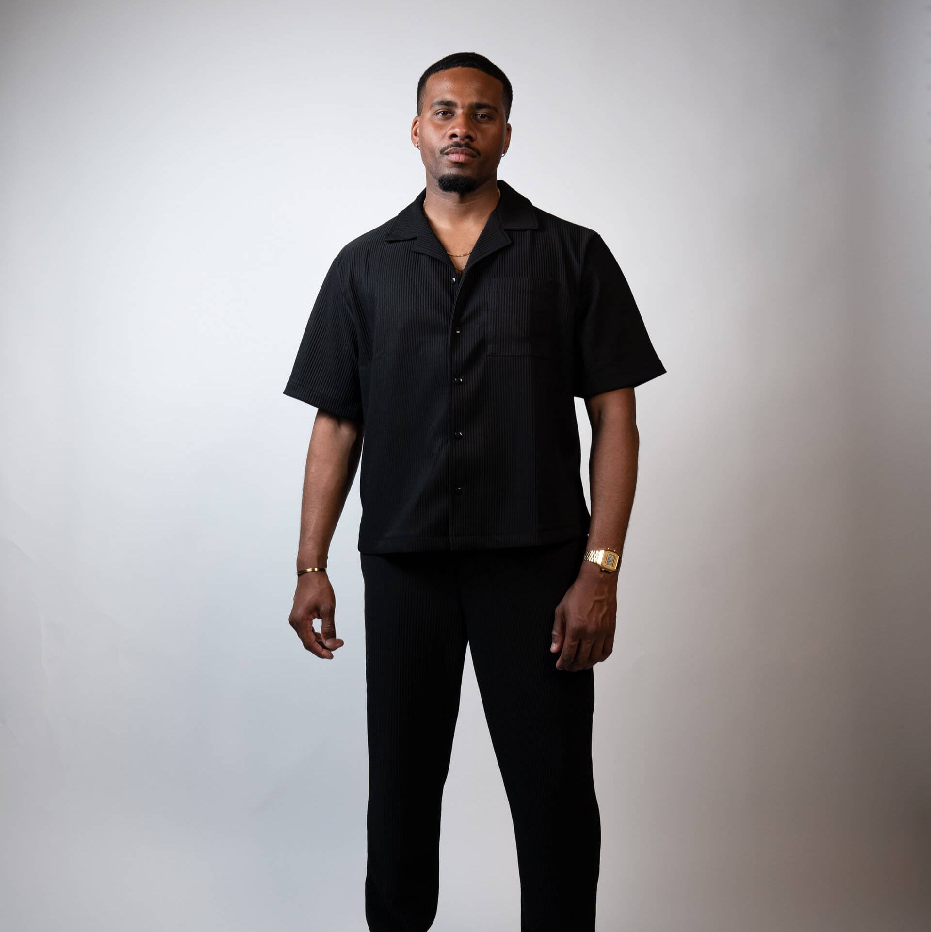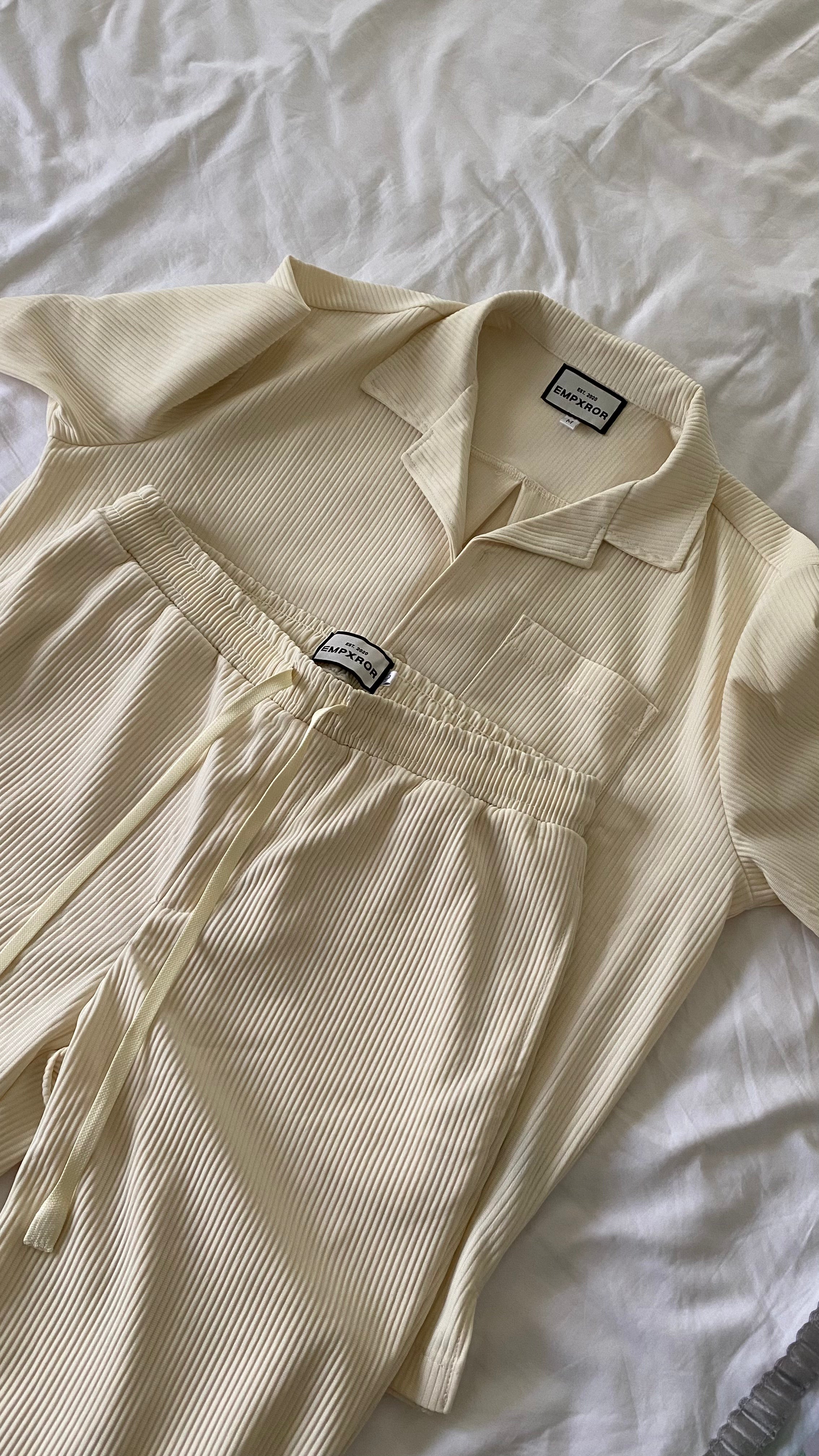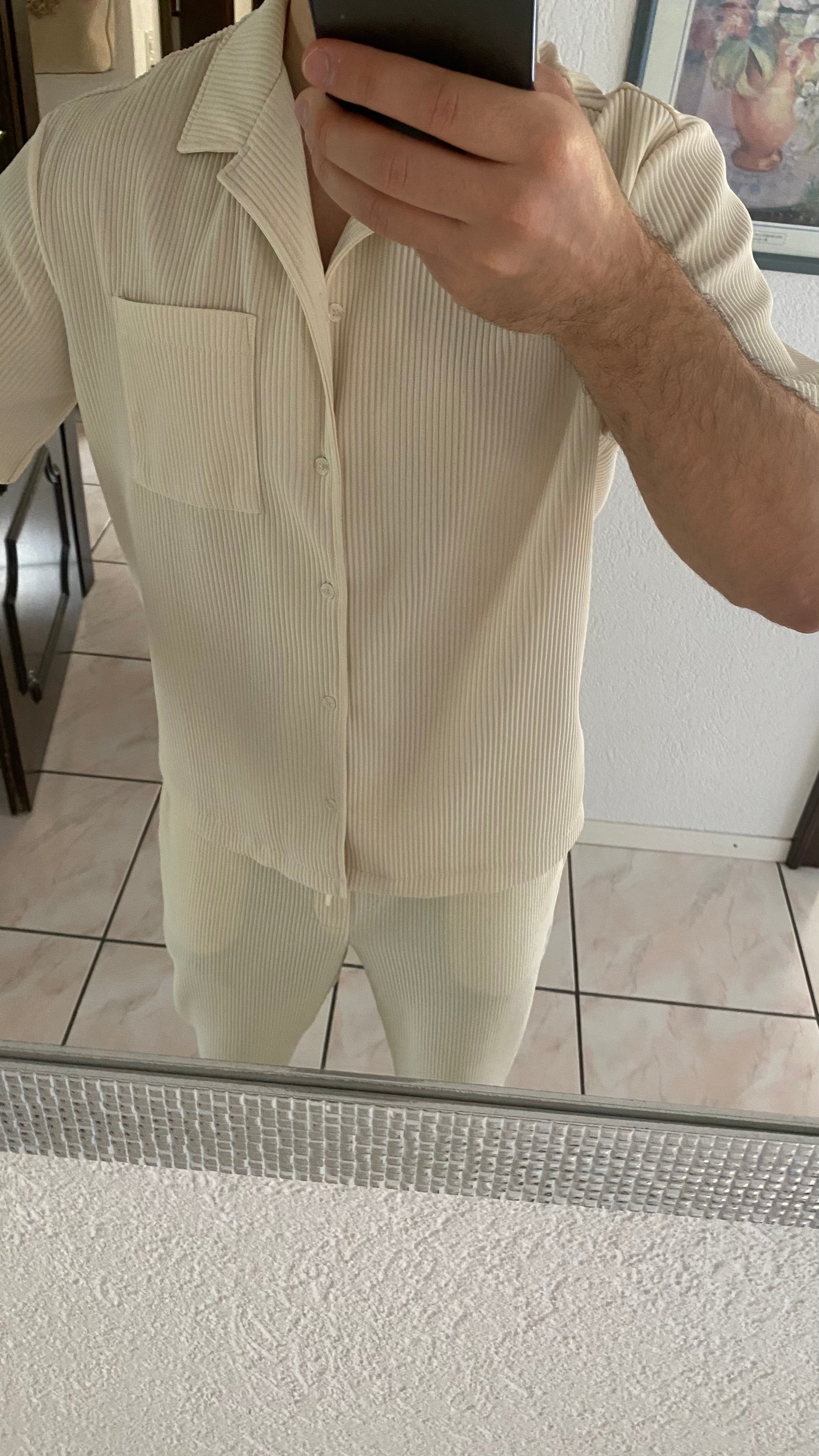 Conçu pour une silhouette affirmée sans effort, cet ensemble associe une coupe oversize maîtrisée à un tissu plissé léger et respirant.